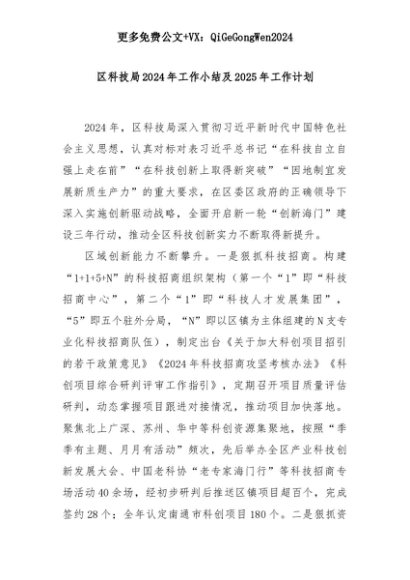 【七哥公文】2025年:区科技局2024年工作小结及2025年工作计划+更多免费公文+VX:QiGeGongWen2024+更多免费公文+VX:QiGeGongWen2024