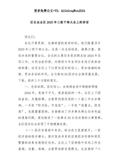 【七哥公文】2025年:区长在全区2025年三级干部大会上的讲话+更多免费公文+VX:QiGeGongWen2024+更多免费公文+VX:QiGeGongWen2024