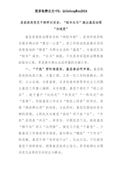 【七哥公文】2025年:县医保局党员干部研讨发言:“轻车壮马”跑出基层治理“加速度”+更多免费公文+VX:QiGeGongWen2024+更多免费公文+VX:QiGeGongWen2024