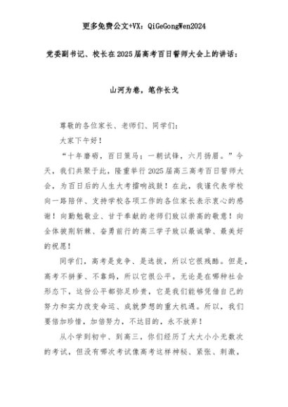 【七哥公文】2025年:党委副书记、校长在2025届高考百日誓师大会上的讲话:山河为卷,笔作长戈+更多免费公文+VX:QiGeGongWen2024+更多免费公文+VX:QiGeGongWen2024