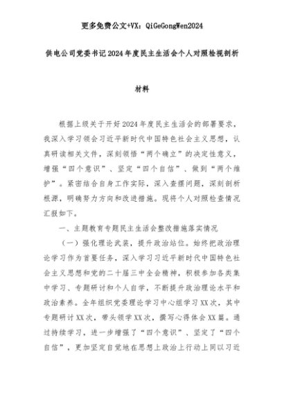【七哥公文】2025年:供电公司党委书记2024年度民主生活会个人对照检视剖析材料+更多免费公文+VX:QiGeGongWen2024+更多免费公文+VX:QiGeGongWen2024