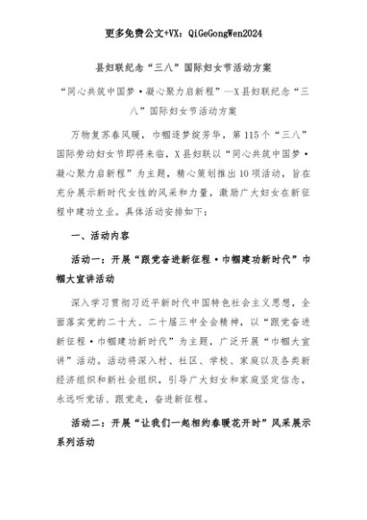 【七哥公文】2025年:县妇联纪念“三八”国际妇女节活动方案+更多免费公文+VX:QiGeGongWen2024+更多免费公文+VX:QiGeGongWen2024