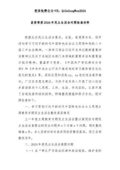 【七哥公文】2025年:县委常委2024年民主生活会对照检查材料+更多免费公文+VX:QiGeGongWen2024+更多免费公文+VX:QiGeGongWen2024