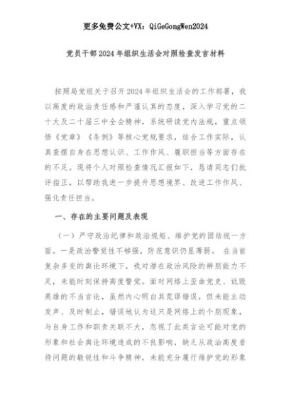 【七哥公文】2025年:党员干部2024年组织生活会对照检查发言材料+更多免费公文+VX:QiGeGongWen2024+更多免费公文+VX:QiGeGongWen2024
