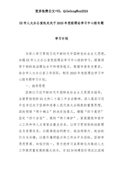 【七哥公文】2025年:XX市人大办公室机关关于2025年党组理论学习中心组专题学习计划+更多免费公文+VX:QiGeGongWen2024+更多免费公文+VX:QiGeGongWen2024