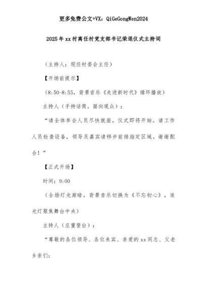【七哥公文】2025年:2025年xx村离任村党支部书记荣退仪式主持词+更多免费公文+VX:QiGeGongWen2024+更多免费公文+VX:QiGeGongWen2024
