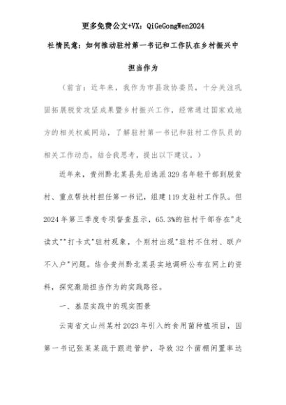 【七哥公文】2025年:2025年社情民意:如何推动驻村第一书记和工作队在乡村振兴中担当作为+更多免费公文+VX:QiGeGongWen2024+更多免费公文+VX:QiGeGongWen2024