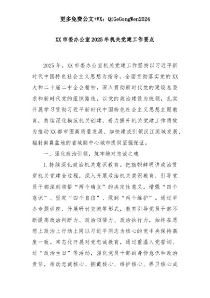 【七哥公文】2025年:XX市委办公室2025年机关党建工作要点+更多免费公文+VX:QiGeGongWen2024+更多免费公文+VX:QiGeGongWen2024