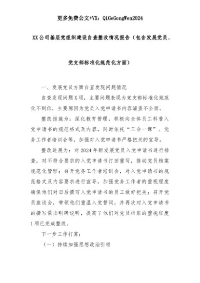 【七哥公文】2025年:XX公司基层党组织建设自查整改情况报告(包含发展党员、党支部标准化规范化方面)+更多免费公文+VX:QiGeGongWen2024+更多免费公文+VX:QiGeGongWen2024