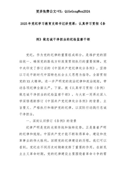 【七哥公文】2025年:2025年党纪学习教育支部书记讲党课:认真学习贯彻《条例》做忠诚干净担当的纪检监察干部+更多免费公文+VX:QiGeGongWen2024+更多免费公文+VX:QiGeGongWen2024