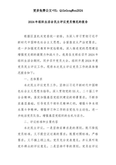 【七哥公文】2025年:2024年组织生活会民主评议党员情况的报告+更多免费公文+VX:QiGeGongWen2024+更多免费公文+VX:QiGeGongWen2024