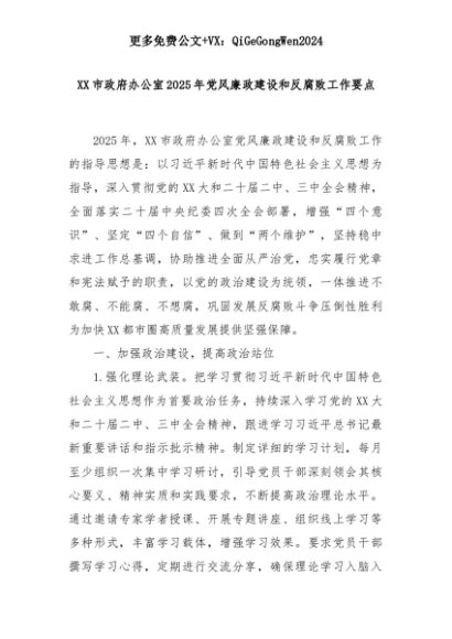【七哥公文】2025年:XX市政府办公室2025年党风廉政建设和反腐败工作要点+更多免费公文+VX:QiGeGongWen2024+更多免费公文+VX:QiGeGongWen2024