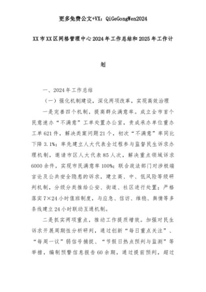 【七哥公文】2025年:XX市XX区网格管理中心2024年工作总结和2025年工作计划+更多免费公文+VX:QiGeGongWen2024+更多免费公文+VX:QiGeGongWen2024