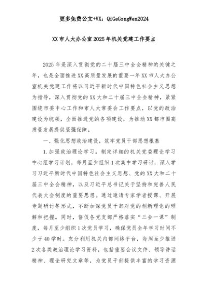 【七哥公文】2025年:XX市人大办公室2025年机关党建工作要点+更多免费公文+VX:QiGeGongWen2024+更多免费公文+VX:QiGeGongWen2024