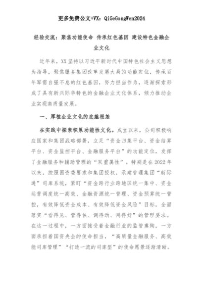 【七哥公文】2025年:经验交流:聚焦功能使命 传承红色基因 建设特色金融企业文化+更多免费公文+VX:QiGeGongWen2024+更多免费公文+VX:QiGeGongWen2024