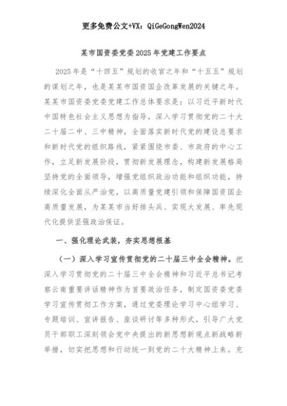 【七哥公文】2025年:某市国资委党委2025年党建工作要点+更多免费公文+VX:QiGeGongWen2024+更多免费公文+VX:QiGeGongWen2024