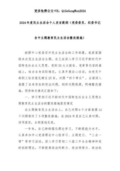 【七哥公文】2025年:2024年度民主生活会个人发言提纲(党委委员,纪委书记含中主题教育民主生活会整改措施)+更多免费公文+VX:QiGeGongWen2024+更多免费公文+VX:QiGeGongWen2024