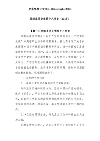 【七哥公文】2025年:(12篇)组织生活会党员个人发言+更多免费公文+VX:QiGeGongWen2024+更多免费公文+VX:QiGeGongWen2024
