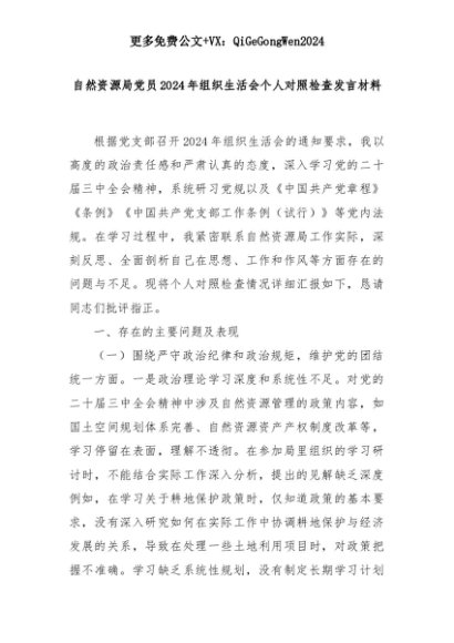 【七哥公文】2025年:自然资源局党员2024年组织生活会个人对照检查发言材料+更多免费公文+VX:QiGeGongWen2024+更多免费公文+VX:QiGeGongWen2024