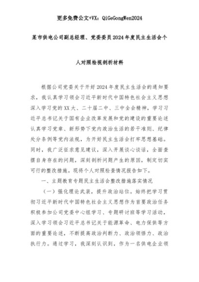 【七哥公文】2025年:某市供电公司副总经理、党委委员2024年度民主生活会个人对照检视剖析材料+更多免费公文+VX:QiGeGongWen2024+更多免费公文+VX:QiGeGongWen2024