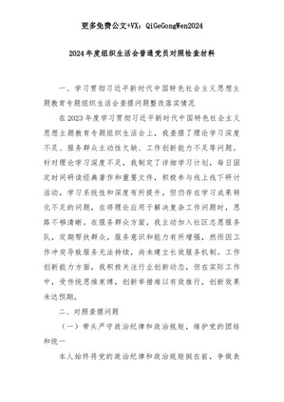【七哥公文】2025年:2024年度组织生活会普通党员对照检查材料+更多免费公文+VX:QiGeGongWen2024+更多免费公文+VX:QiGeGongWen2024