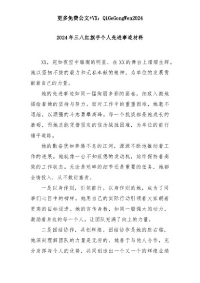 【七哥公文】2025年:2024年三八红旗手个人先进事迹材料+更多免费公文+VX:QiGeGongWen2024+更多免费公文+VX:QiGeGongWen2024