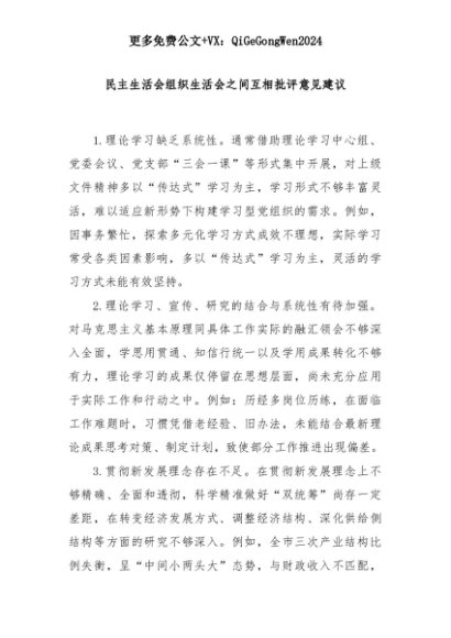 【七哥公文】2025年:民主生活会组织生活会之间互相批评意见建议+更多免费公文+VX:QiGeGongWen2024+更多免费公文+VX:QiGeGongWen2024