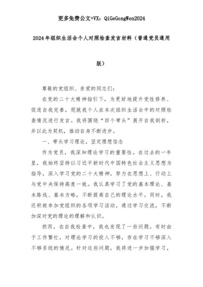 【七哥公文】2025年:2024年组织生活会个人对照检查发言材料(普通党员通用版)+更多免费公文+VX:QiGeGongWen2024+更多免费公文+VX:QiGeGongWen2024