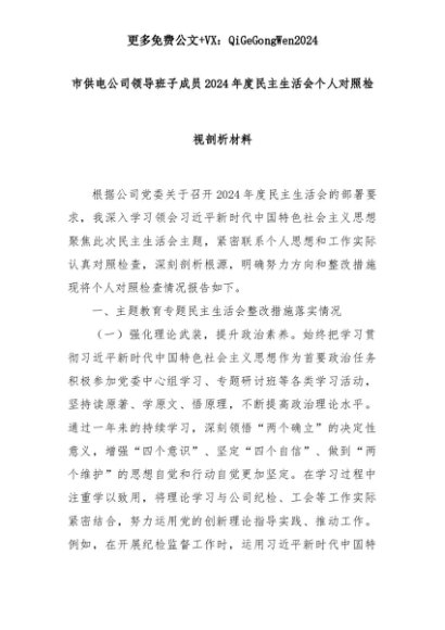 【七哥公文】2025年:市供电公司领导班子成员2024年度民主生活会个人对照检视剖析材料+更多免费公文+VX:QiGeGongWen2024+更多免费公文+VX:QiGeGongWen2024