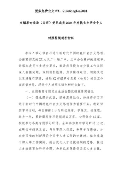 【七哥公文】2025年:市烟草专卖局(公司)党组成员2024年度民主生活会个人对照检视剖析材料+更多免费公文+VX:QiGeGongWen2024+更多免费公文+VX:QiGeGongWen2024