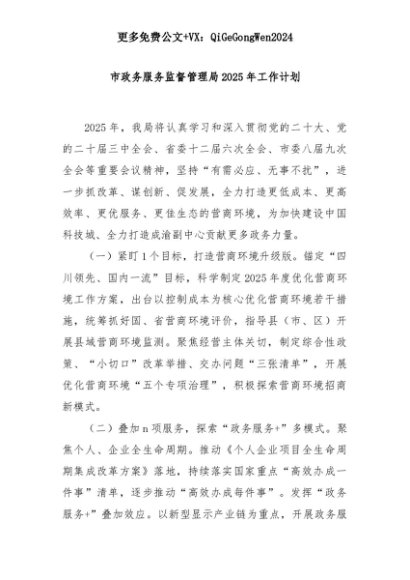【七哥公文】2025年:市政务服务监督管理局2025年工作计划+更多免费公文+VX:QiGeGongWen2024+更多免费公文+VX:QiGeGongWen2024