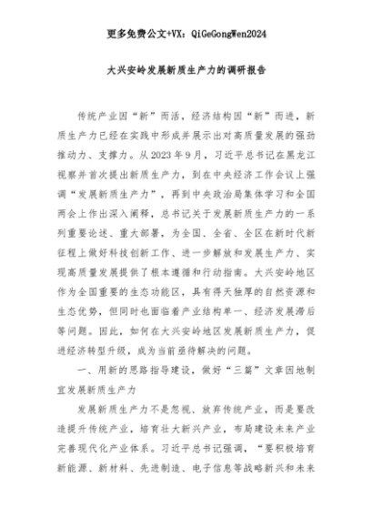 【七哥公文】2025年:大兴安岭发展新质生产力的调研报告+更多免费公文+VX:QiGeGongWen2024+更多免费公文+VX:QiGeGongWen2024