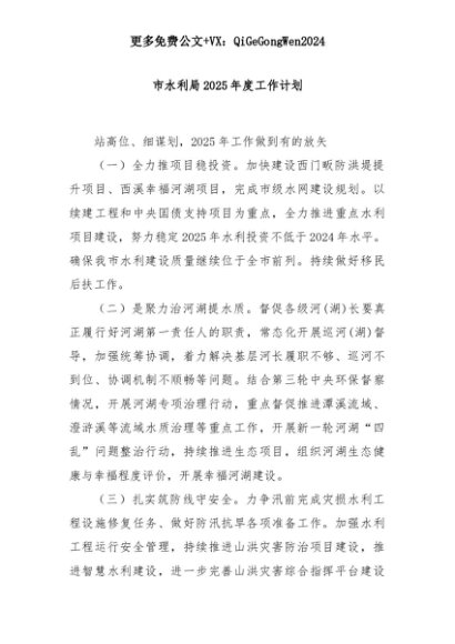 【七哥公文】2025年:市水利局2025年度工作计划+更多免费公文+VX:QiGeGongWen2024+更多免费公文+VX:QiGeGongWen2024