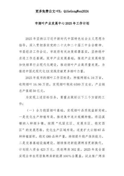 【七哥公文】2025年:市烟叶产业发展中心2025年工作计划+更多免费公文+VX:QiGeGongWen2024+更多免费公文+VX:QiGeGongWen2024