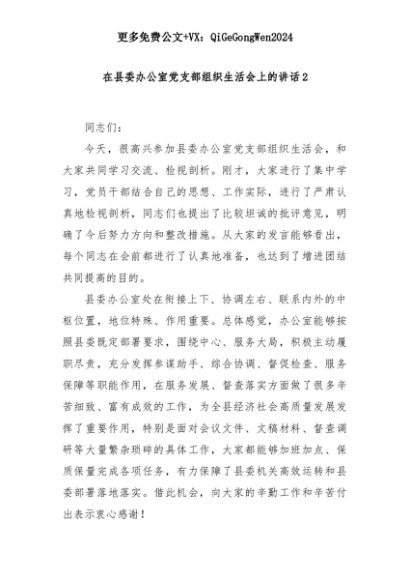 【七哥公文】2025年:在县委办公室党支部组织生活会上的讲话2+更多免费公文+VX:QiGeGongWen2024+更多免费公文+VX:QiGeGongWen2024