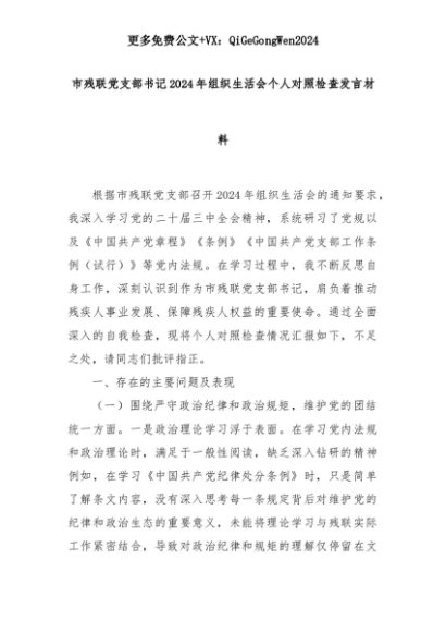 【七哥公文】2025年:市残联党支部书记2024年组织生活会个人对照检查发言材料+更多免费公文+VX:QiGeGongWen2024+更多免费公文+VX:QiGeGongWen2024