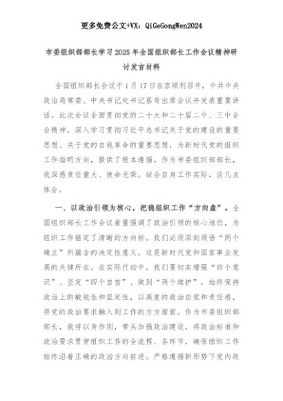 【七哥公文】2025年:市委组织部部长学习2025年全国组织部长工作会议精神研讨发言材料+更多免费公文+VX:QiGeGongWen2024+更多免费公文+VX:QiGeGongWen2024