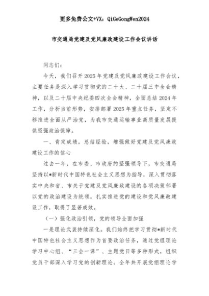 【七哥公文】2025年:市交通局党建及党风廉政建设工作会议讲话+更多免费公文+VX:QiGeGongWen2024+更多免费公文+VX:QiGeGongWen2024