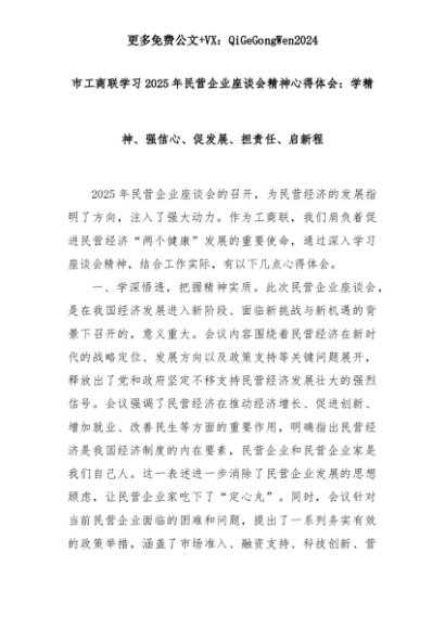 【七哥公文】2025年:市工商联学习2025年民营企业座谈会精神心得体会:学精神、强信心、促发展、担责任、启新程+更多免费公文+VX:QiGeGongWen2024+更多免费公文+VX:QiGeGongWen2024