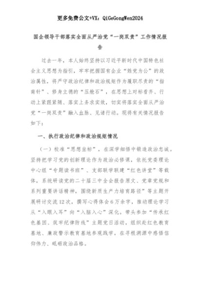 【七哥公文】2025年:国企领导干部落实全面从严治党“一岗双责”工作情况报告+更多免费公文+VX:QiGeGongWen2024+更多免费公文+VX:QiGeGongWen2024