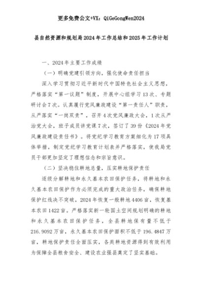 【七哥公文】2025年:县自然资源和规划局2024年工作总结和2025年工作计划+更多免费公文+VX:QiGeGongWen2024+更多免费公文+VX:QiGeGongWen2024