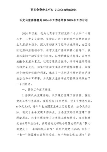 【七哥公文】2025年:区文化旅游体育局2024年工作总结和2025年工作计划+更多免费公文+VX:QiGeGongWen2024+更多免费公文+VX:QiGeGongWen2024