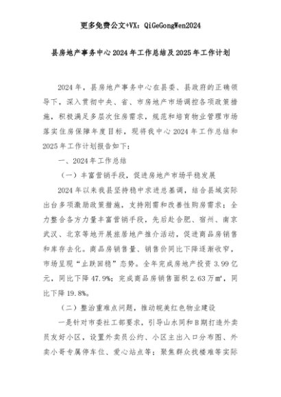 【七哥公文】2025年:县房地产事务中心2024年工作总结及2025年工作计划+更多免费公文+VX:QiGeGongWen2024+更多免费公文+VX:QiGeGongWen2024