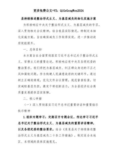 【七哥公文】2025年:县持续推进整治形式主义、为基层减负的细化实施方案+更多免费公文+VX:QiGeGongWen2024+更多免费公文+VX:QiGeGongWen2024