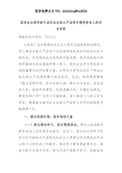 【七哥公文】2025年:国有企业领导班子成员在全面从严治党专题党委会上的发言材料+更多免费公文+VX:QiGeGongWen2024+更多免费公文+VX:QiGeGongWen2024