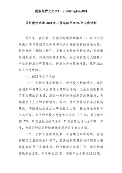 【七哥公文】2025年:区科学技术局2024年工作总结及2025年工作计划+更多免费公文+VX:QiGeGongWen2024+更多免费公文+VX:QiGeGongWen2024