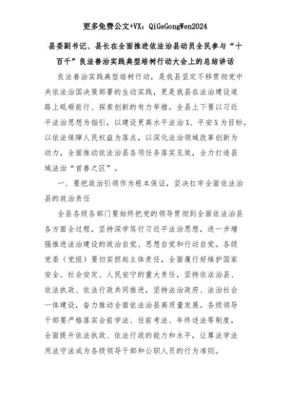 【七哥公文】2025年:县委副书记、县长在全面推进依法治县动员全民参与“十百千”良法善治实践典型培树行动大会上的总结讲话+更多免费公文+VX:QiGeGongWen2024+更多免费公文+VX:QiGeGongWen2024