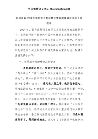 【七哥公文】2025年:县司法局2024年领导班子政治建设暨政绩观调研分析自查报告+更多免费公文+VX:QiGeGongWen2024+更多免费公文+VX:QiGeGongWen2024