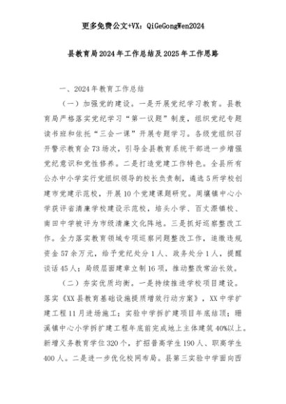 【七哥公文】2025年:县教育局2024年工作总结及2025年工作思路+更多免费公文+VX:QiGeGongWen2024+更多免费公文+VX:QiGeGongWen2024