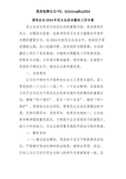 【七哥公文】2025年:国有企业2024年民主生活会整改工作方案+更多免费公文+VX:QiGeGongWen2024+更多免费公文+VX:QiGeGongWen2024